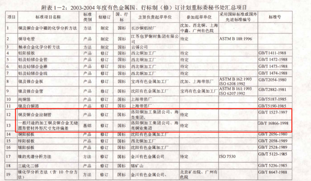 有色金屬標(biāo)準(zhǔn)化工作對(duì)提升企業(yè)有色金屬行業(yè)地位有著重要的作用和顯著的意義。海亮集團(tuán)主持起草的第一份國(guó)家標(biāo)準(zhǔn)是GB/T1527《銅及銅合金拉制管》標(biāo)準(zhǔn)和GB/T16866《一般用途的加工銅及銅合金無縫圓形管材外形尺寸及允許偏差》標(biāo)準(zhǔn),這兩項(xiàng)國(guó)家標(biāo)準(zhǔn)修訂標(biāo)志著公司當(dāng)時(shí)生產(chǎn)規(guī)模、技術(shù)水平已在同行業(yè)有著重要的影響,成為有色金屬行業(yè)第一家起草國(guó)家標(biāo)準(zhǔn)的民營(yíng)企業(yè)。