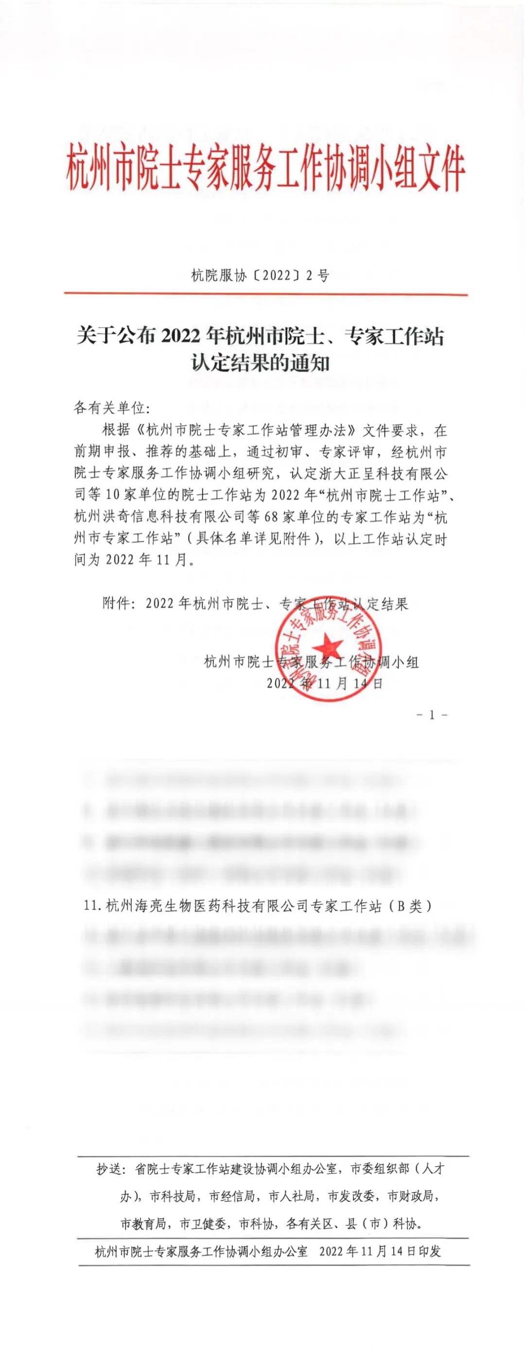 11月14日,杭州市院士專家服務工作協調小組發布《關于公布2022年杭州市院士、專家工作站認定結果的通知》,杭州海亮生物醫藥科技有限公司專家工作站被正式認定為“杭州市專家工作站”